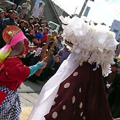 早朝から各戸を天狗と獅子が笛や太鼓に合わせて玄関先で舞い、