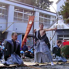 悪疫退散や大漁、豊作を祈り、毎年行われるものです。 既婚の青年が3名、順に的をめがけ矢を射っていきます。